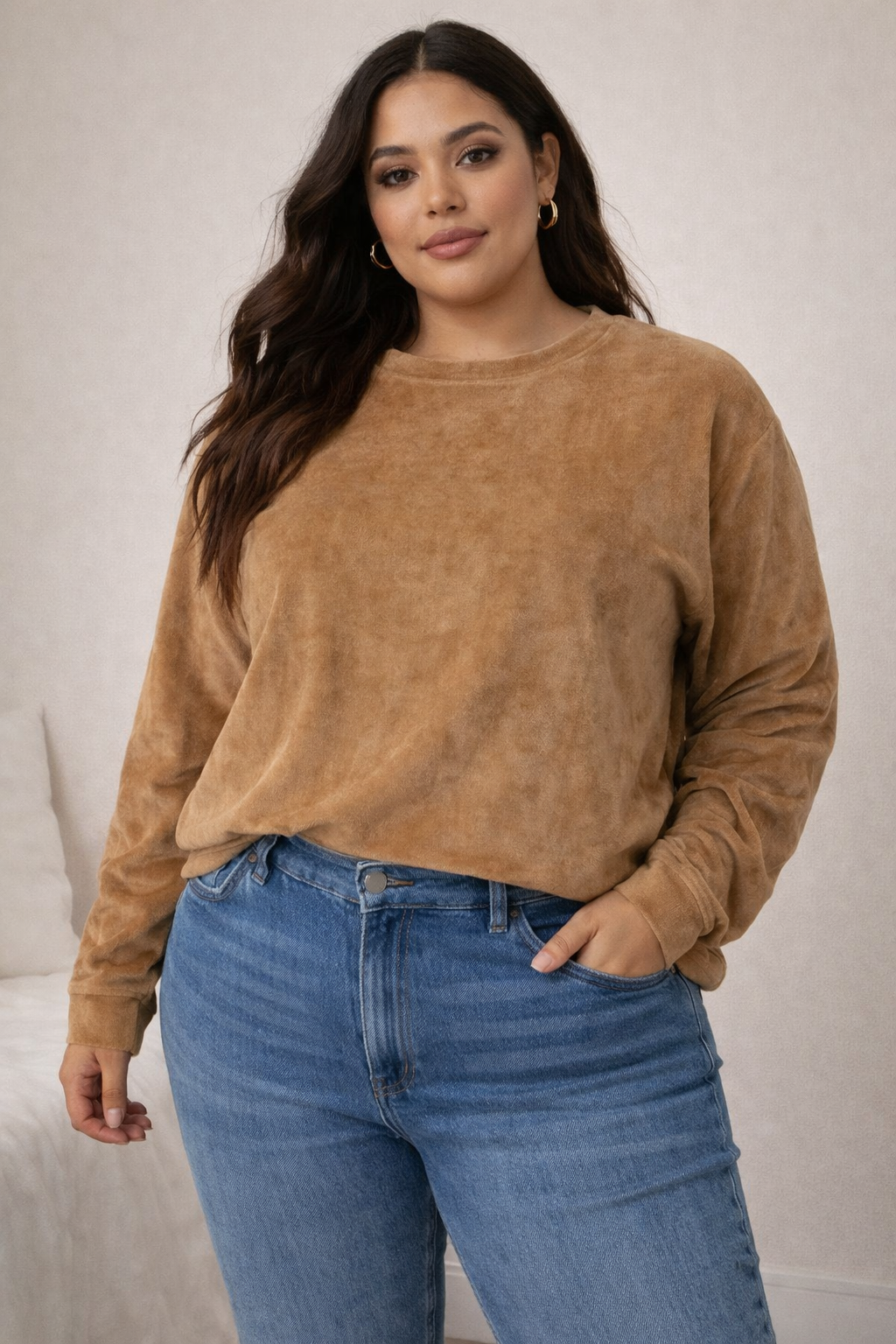 Essa blusa em tecido plush tem toque extremamente macio e quentinho, ideal para os dias mais frescos sem perder a elegância.