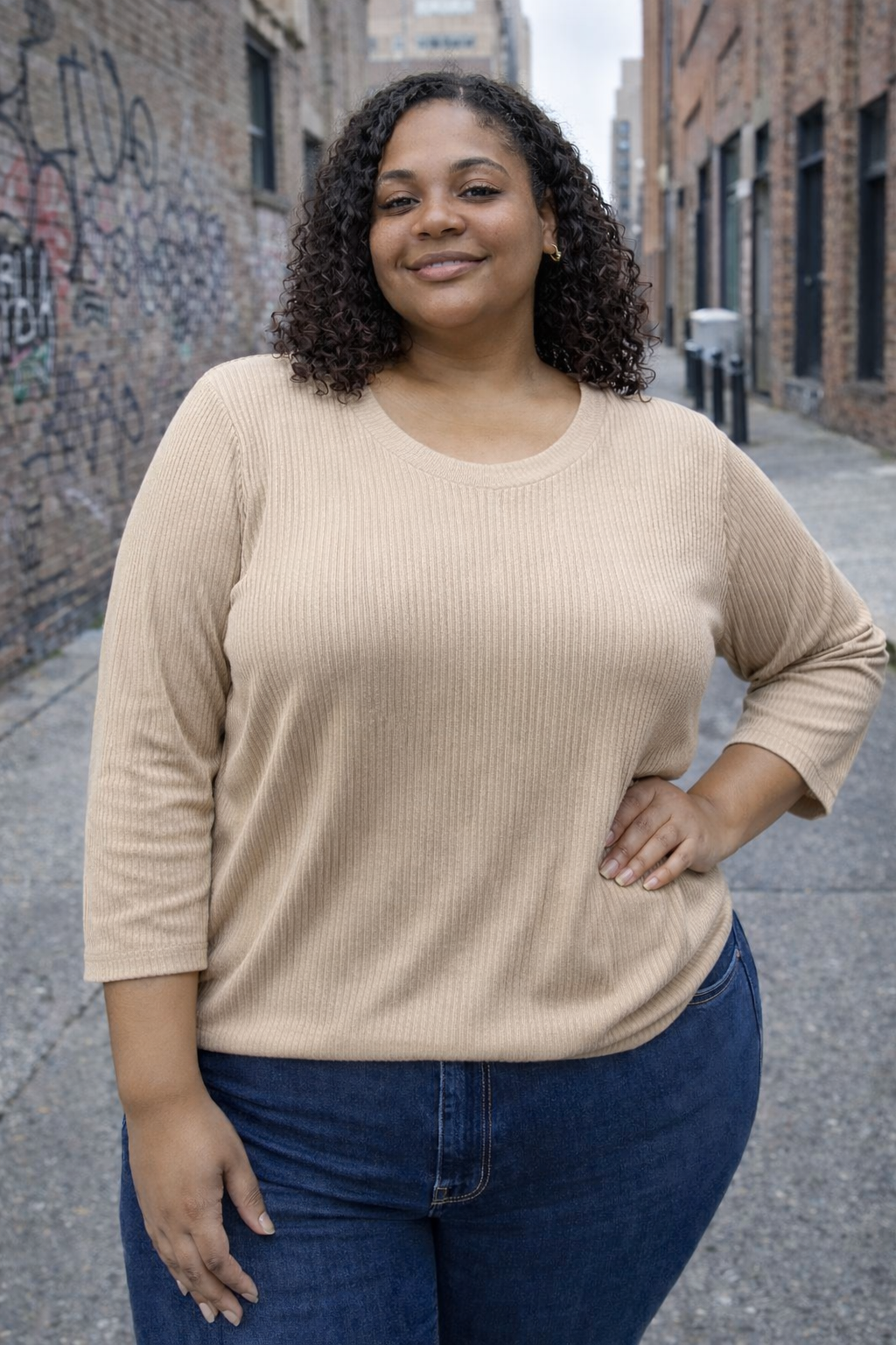 Blusa plus size de lino em cor bege, versátil e confortável. Com mangas 3/4 e um corte clássico, essa blusa é perfeita para qualquer ocasião. O colarinho redondo fechado adiciona um toque de elegância e sofisticação.