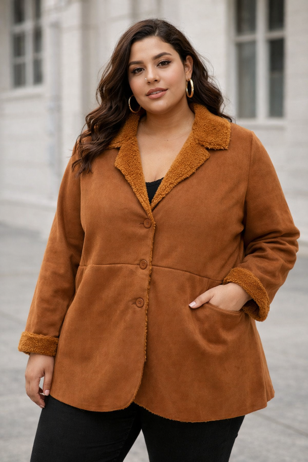 Casaco feminino plus size confeccionado em tecido tipo suede, com toque macio e acabamento sofisticado. O modelo possui forro interno e detalhes em sherpa (peluciado) na gola e nos punhos, proporcionando ainda mais conforto térmico e estilo nos dias frios.