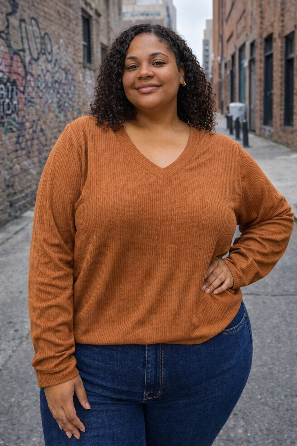 Blusa plus size de mangas longas e decote em V, disponível nos cores preta e caramelo. Com um design clássico e elegante, essa blusa é perfeita para qualquer ocasião.