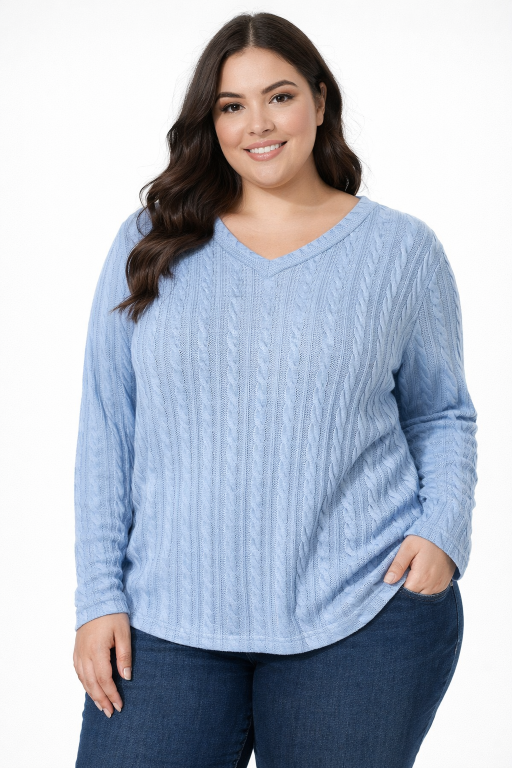 Suéter feminino plus size em tricô, confeccionado em malha macia com textura em tranças que agrega charme e sofisticação ao visual.